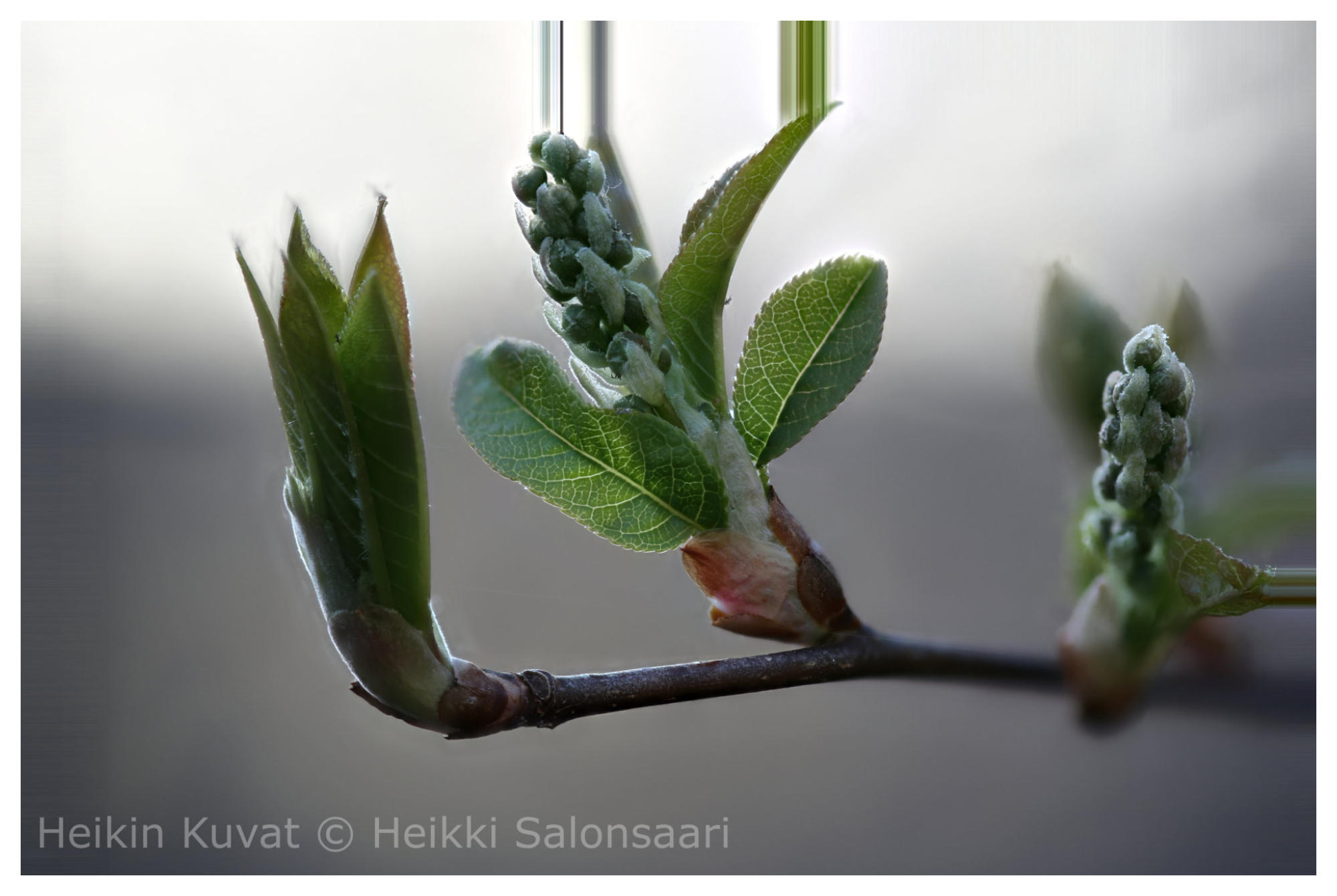 Jälleen pinottuja Testailin kuinka paljon syvyystarkkuutta voi lisätä pinoamalla. Ohessa on tuon kokeilun tuloksena neljä kuvaa. Ensimmäisessä on seitsemäntoista kuvan kooste raita -puun kukinnosta. Kuvassa terävyysalue on hieman yli kolme senttiä. Kuvia ottaessani käytössäni ei ollut makrokiskoa, joten siirsin tarkennuspistettä manuaalisti. Keskimääräinen tarkennusväli on hieman yli kaksi millimetriä. Käytännössä tarkennusväli on paikoin on pitempi. Tämä näkyy parhaiten oksassa, jossa on epäterävyyskohtia. Lopputulos on kuitenkin tyydyttävä. Kuvan alla ovat kuvasarjan sekä ensimmäinen että viimeinen kuva Seuraavana on samasta aiheesta kuva, joka on pinottu sadasta kuvasta. Terävyysalue koosteessa on viitisen senttimetriä. Ts. kahden perättäisen kuvan tarkennuspisteen väli on puoli millimetriä. Tällä kertaa käytössäni oli makrokisko, jolla on helppo siirtää kameraa tasaisesti todella lyhyin välein. Tässä koosteessa epätarkkuuksia ei ole. Pikkukuvat ovat jälleen kuvasarjan ensimmäinen ja viimeinen. Kolmantena tässä sarjassa on kuva tuomen kukan nupuista. Kuvasrarjassa on kuusikymmentäviisi kuvaa. Tavoiteltu syväterävyys oli 6 - 7 cm. Tämä kuitenkin johtiLopputulos on mielenkiintoinen. Kuvan keskellä yläreunassa on ylimääräsiä viivoja. Viivat selittyvä sillä, että kameran suuresta liikkeestä johtuen kohteen koko kuva-alassa muuttuu. Tämä näkyy hyvin kuvan alla olevissa pikkukuvissa. Ensimmäisessä kuvassa kohde mahtuu kuva-alaan hyvin. Toisessa kuvassa kohde täyttää kuva-alan lähes kokonaan. Kuvia yhditetäessä käyttämäni sovellut ei välttämätta kykene tunnistamaan kunnolla eri kokoisia kuvia. Tällaisella lopputuloksella ei ole paljoa käyttöä. Otin sen kuitenkin tähän kuvaamaan ongelmaa, joka syväterävyyden kasvattamisessa syntyy. Viimeisenä on kuva hortensiasta. Kuva on pinottu sadan neljän kuvan sarjasta. Kuvan alla on kuvasarjan ensimmäinen ja viimeinen kuva. Jouduin säätämään kuvien valotuksen ennen lopullista pinoamista. Vaikka otin kuvat vaihtamatta valotusta millään tavalla, pinoamiseen käyttämäni sovellus ilmoitti, että kuvien valoisuus poikkeaa toisistaan peräti 45 %. Tämä johtunee siitä, että liikuin kuvatessani, jolloin kohteen valaistus muuttui. Alinna on alkuperäinen kuva. Näiden kokeilujen lopputuloksena voi todeta, että kovin suuren syväteävyyden tavoittelu pinoamistekniikalla ei ole aivan ongelmatonta. Onnistuessaan pinoaminen tuo kokonaan uuden ilmeen myös lähikuville ei pelkästään makrokuville.